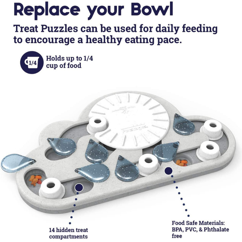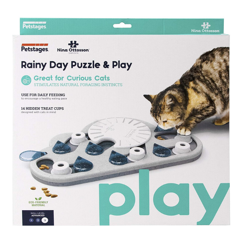 Your smarty cats will love the challenge of the Rainy Day Puzzle & Play! Cats bat at the pegs, spin the wheel, and swivel the raindrops to uncover the 14 hidden treat compartments. Adjust the difficulty of the puzzle to make it easier for beginners or more challenging for super smarty cats. Let the games begin!