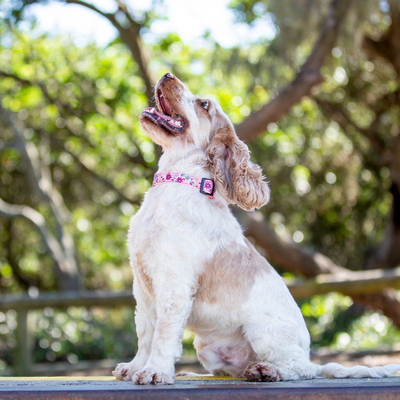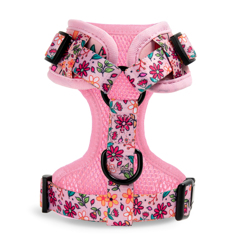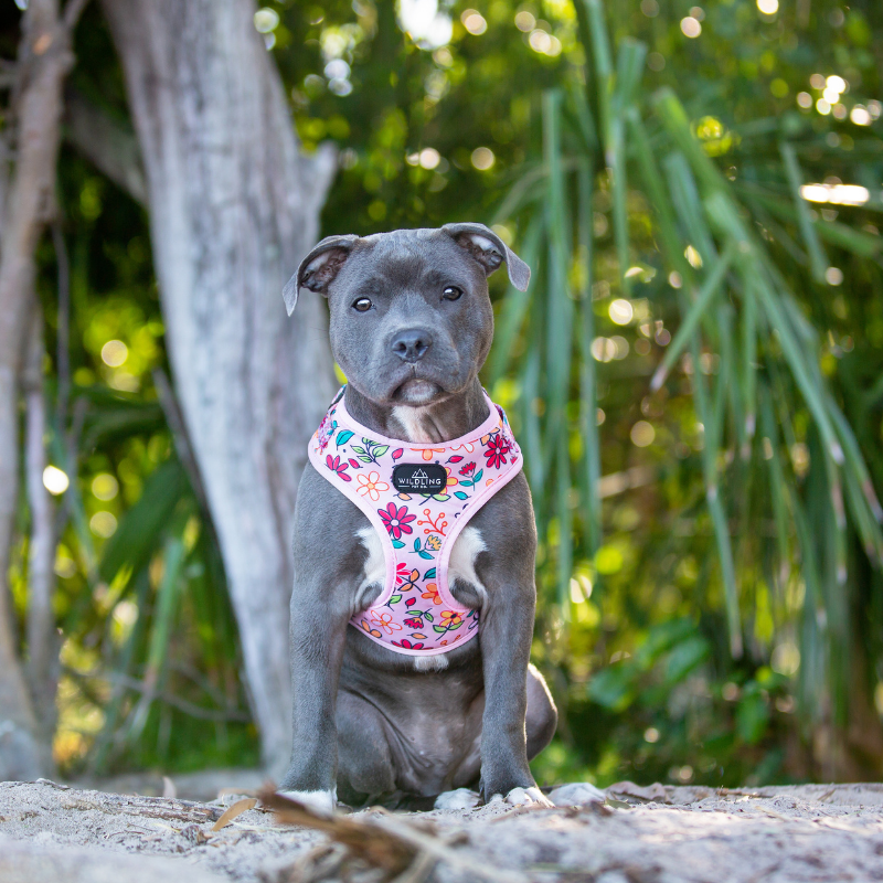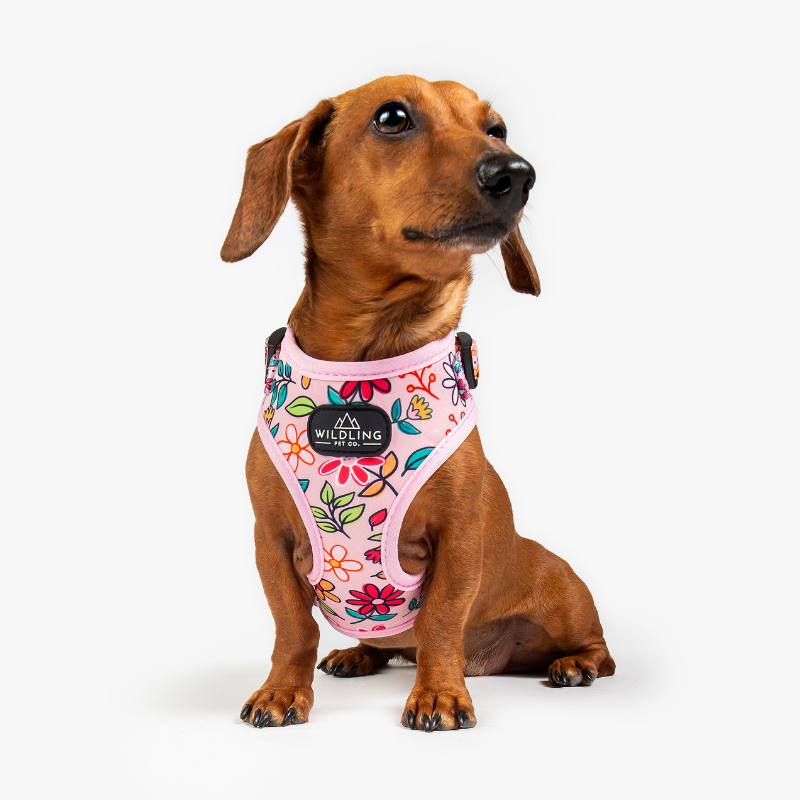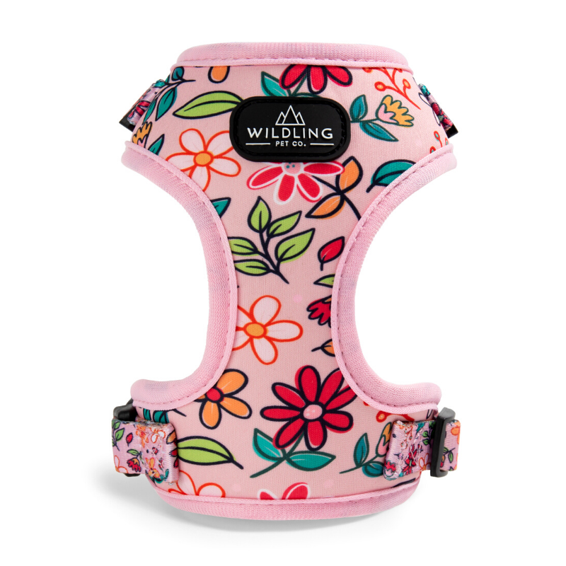 The Bloomin adjustable dog harness from Wildling Pet Co. features a pretty floral print against a soft pink background.