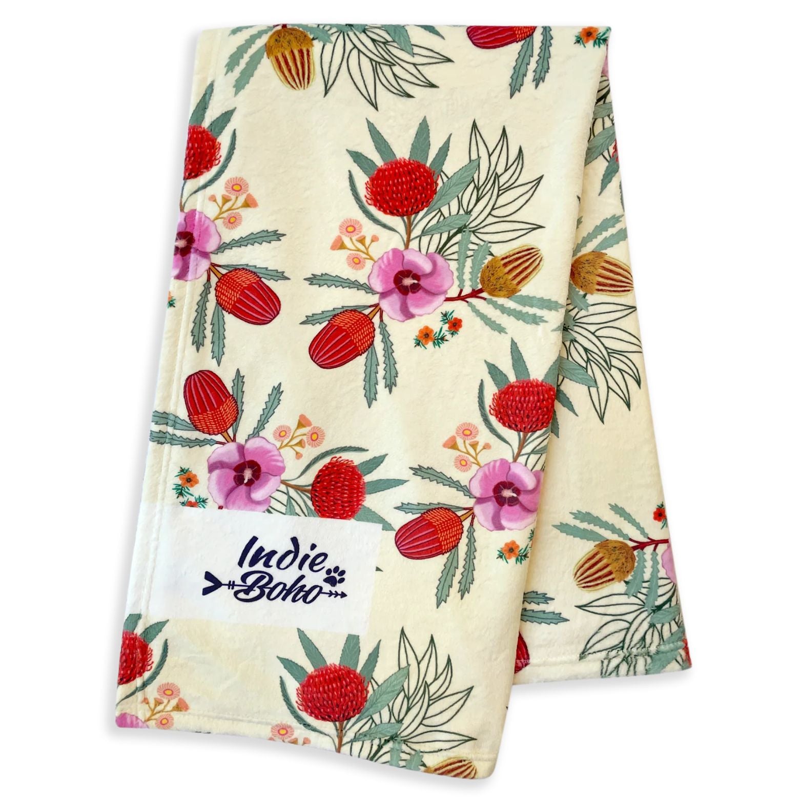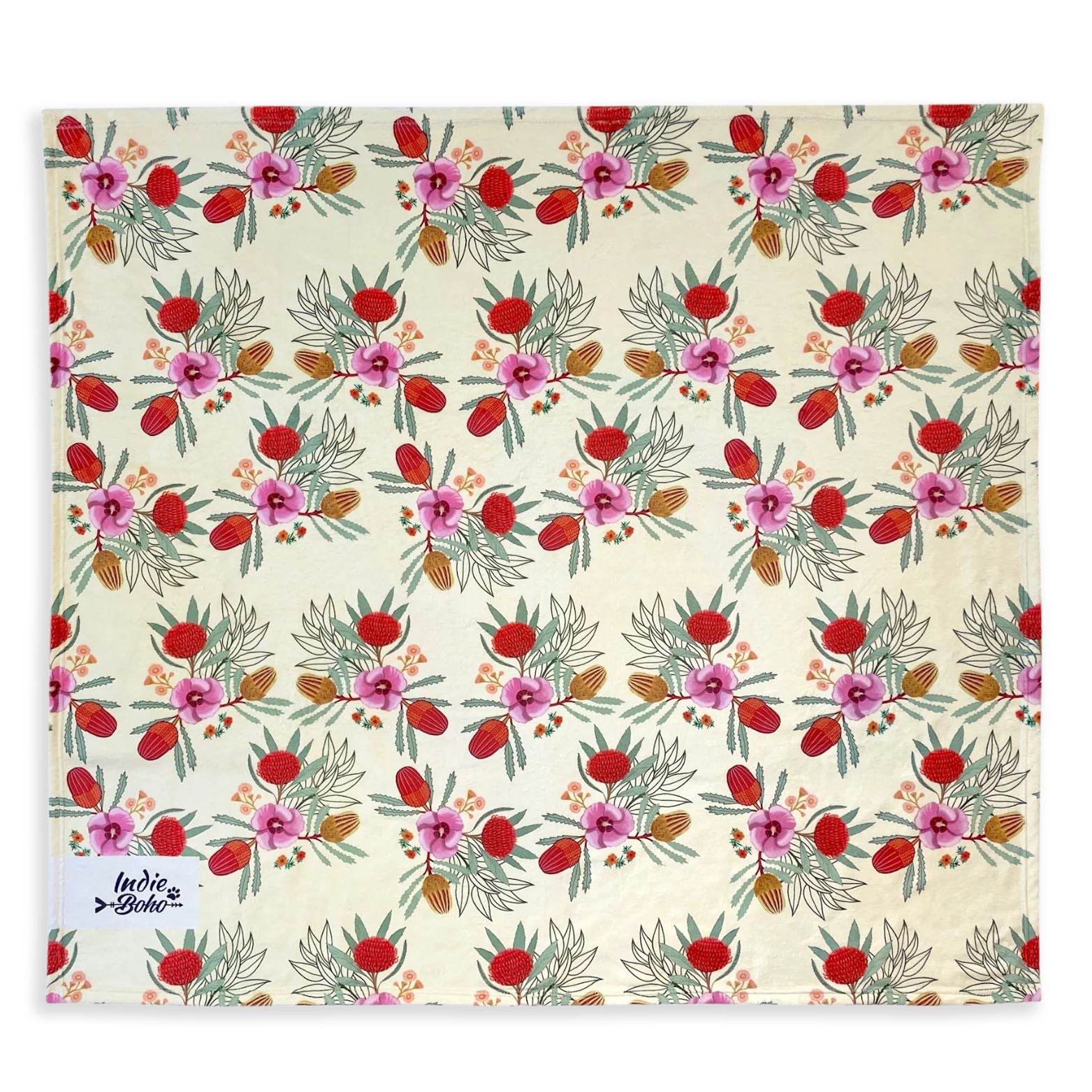 This super soft designer Native Flora luxury pet blanket from Indie Boho depicts Australian wildflowers and plants in vivid sunny colours and was illustrated by renowned Melbourne artist Debi Hudson (who also designed the Indie Boho Foxy Tales collection). The blanket is very pale yellow in colour with lush natives to compliment the cushion bed design.