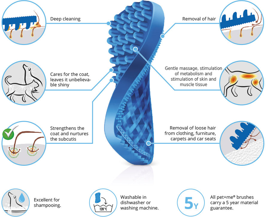 It is not without reason that pet+me® is recommended by experts and veterinarians. The silicone material is completely free of harmful chemicals or metals. The flexible grooming brushes are very gentle and can also be used on sensitive areas such as the eye areas or the muzzle. At the same time, arrow brushes are extremely effective in removing dandruff or shedding hair. Each coloured brush has different bristles according to pet size/hair type.