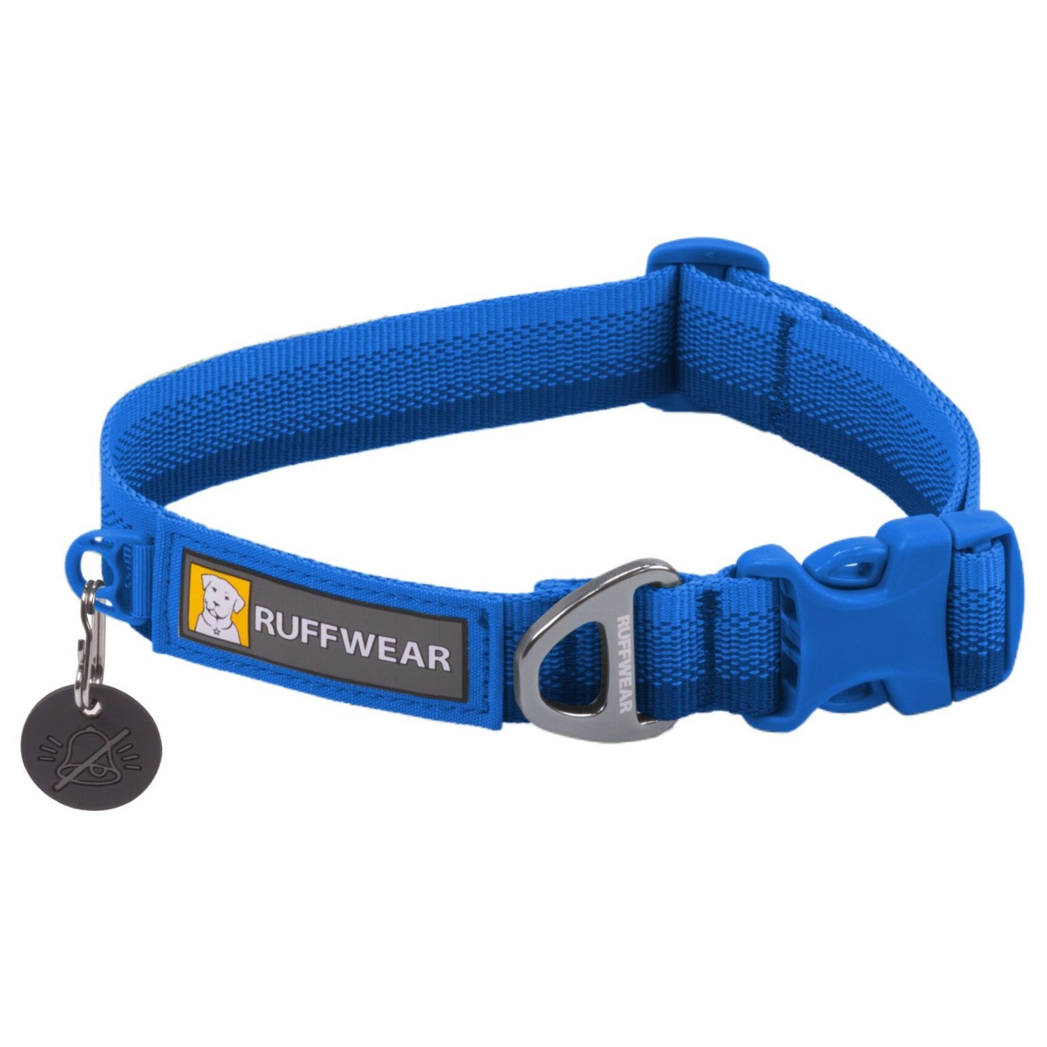 It includes Ruffwear's signature collar features: an aluminium V-ring, separate ID tag attachment point, a silicone tag silencer, and strong and comfortable webbing that holds its colour. The webbing now includes recycled content for a reduced impact on the planet.