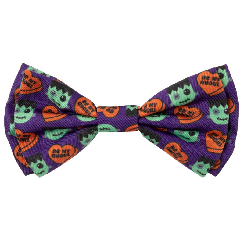 The Halloween bow tie features a colour poppin' print full of green Frankie the Frankenstein heads and orange be my ghoul candy hearts on a purple background.
