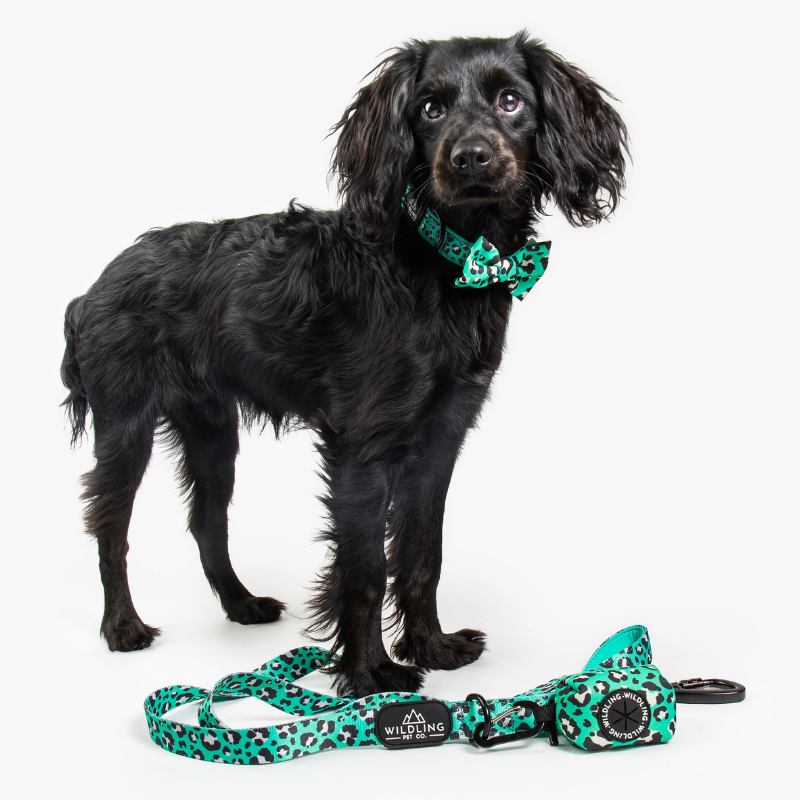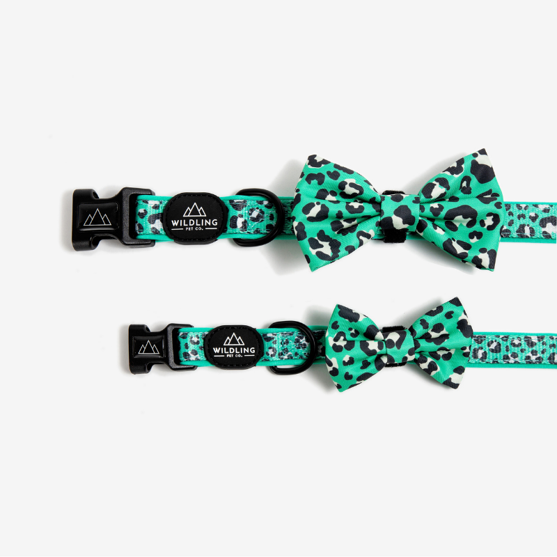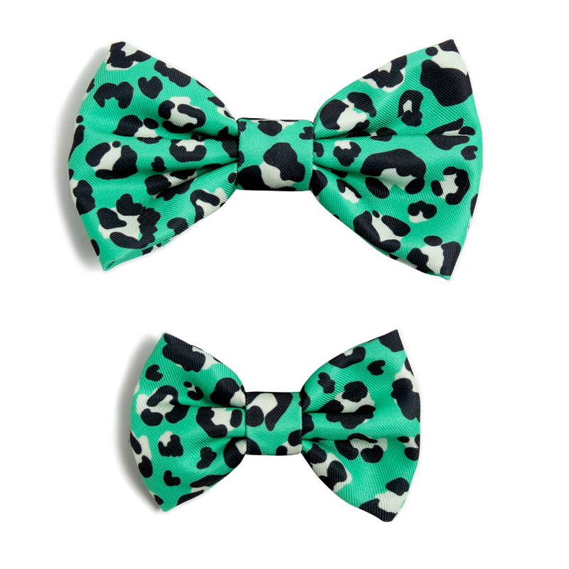 Add a touch of style to any look with the Leap Bow Tie from Wildling Pet Co., featuring a black and white leopard print pattern against a stunning green background.