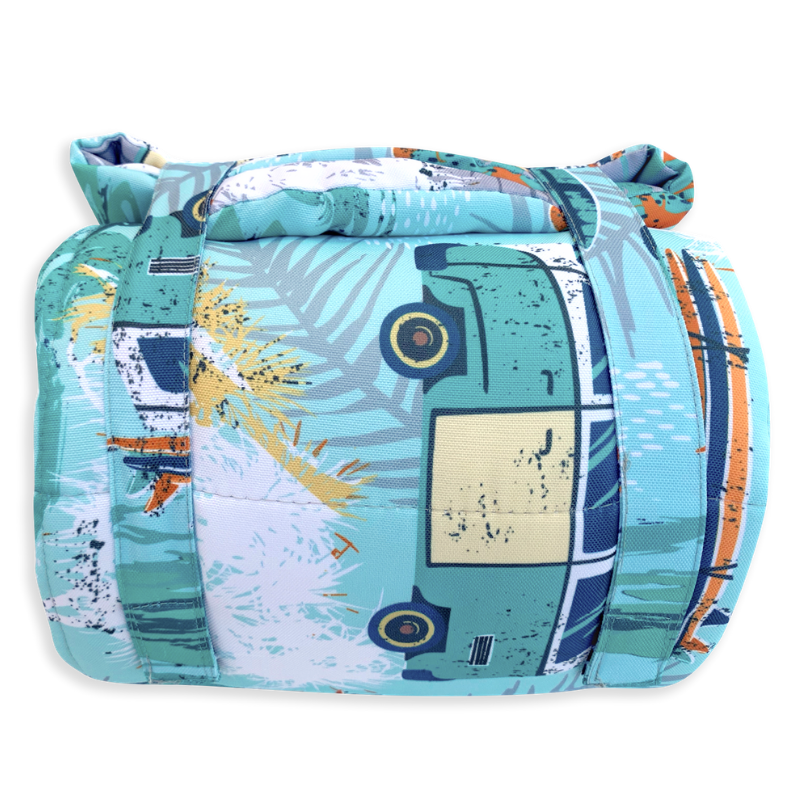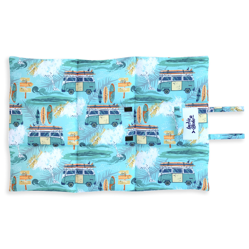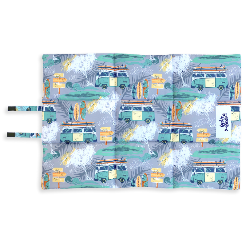 Byron Surf is an original Indie Boho design that features a vagabond scene of retro kombi vans, surf boards, gnarly waves and tropical pandanus trees.