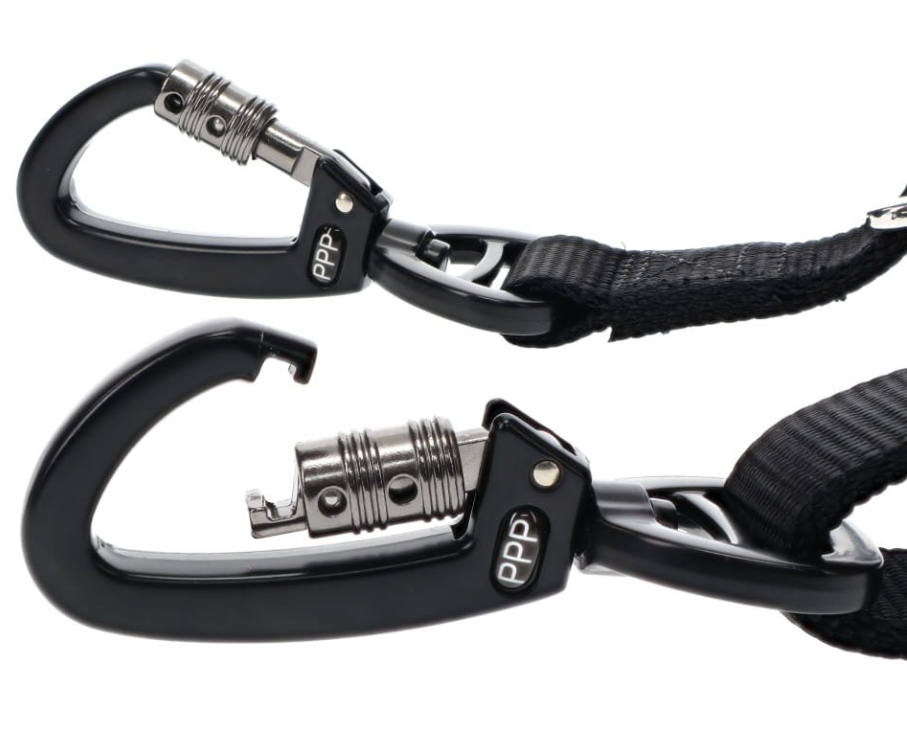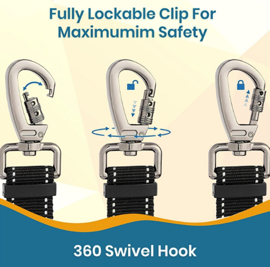 Each clip includes a locking mechanism that pushes up, preventing accidental openings even during bumpy rides. Plus, the swivel design helps eliminate twisting of the Ute Dog Tie, allowing for more freedom of movement.